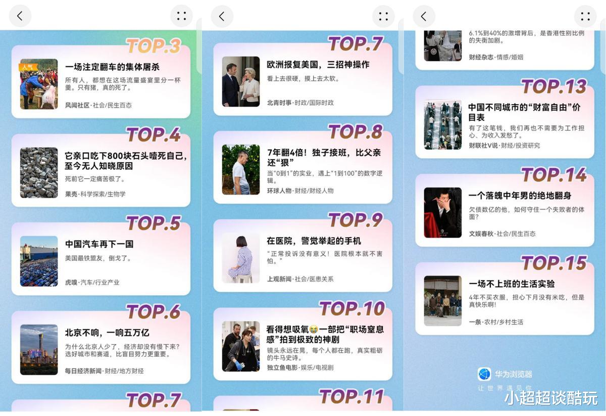 华为浏览器里面的视界阅读周榜不是那种靠算法硬塞给你的信息流,而是实打实上周用户最多浏览点击的的视界内容文章精选。就拿这周刷新的 TOP 15 榜单来说,质量真的高。