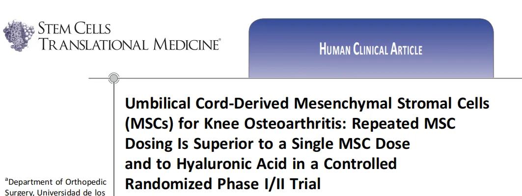 《StemCellsTranslationalMedicine》期刊发表的临床试验,该研究旨在评估关节内注射单次或重复注射脐带间充质干细胞(UC-MSCs)治疗膝关节骨性关节炎的安全性和有效性。