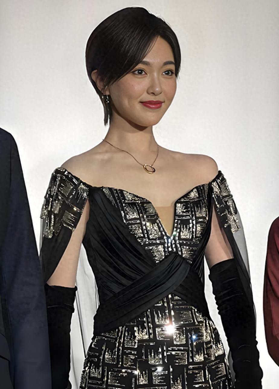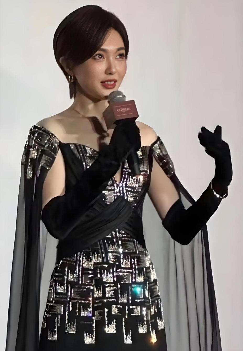 肩膀与手臂交接的地方加入了不透的面料和微透薄纱,前者可以遮住部分手臂肌肤,后者为黑纱,具有微透特点的同时极具飘逸效果。黑纱长度是拖地的,不适合日常出门逛街穿,但参加活动、走红毯很合适,这种长度的薄纱衬得人更大气。