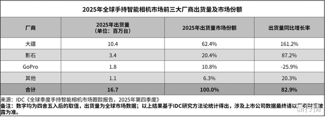 据IDC数据,2025年,大疆以1040万台出货量、62.4%的全球市场份额领跑手持智能相机市场,影石则以340万台出货量、20.4%的全球市场份额紧跟其后,排名第二。