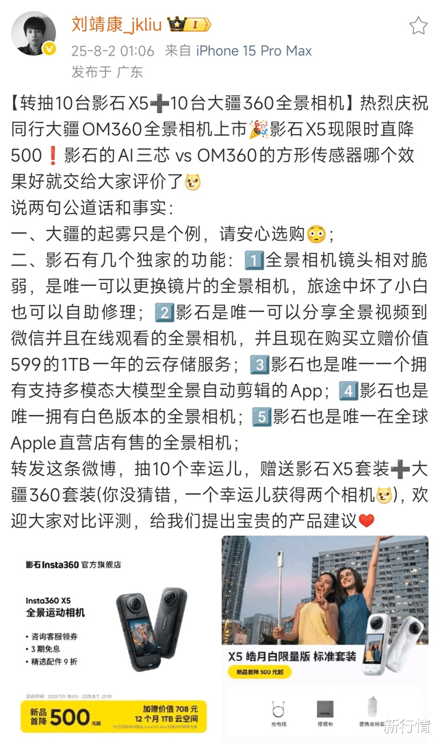 影石创始人刘靖康还公开表态:“可能有一部分因为我们影石的原因导致DJI大幅降价”,并为10 月2–8 日购买大疆产品的用户发放100元无门槛券,同时发起微博抽奖。即便是营销,火药味也不轻。