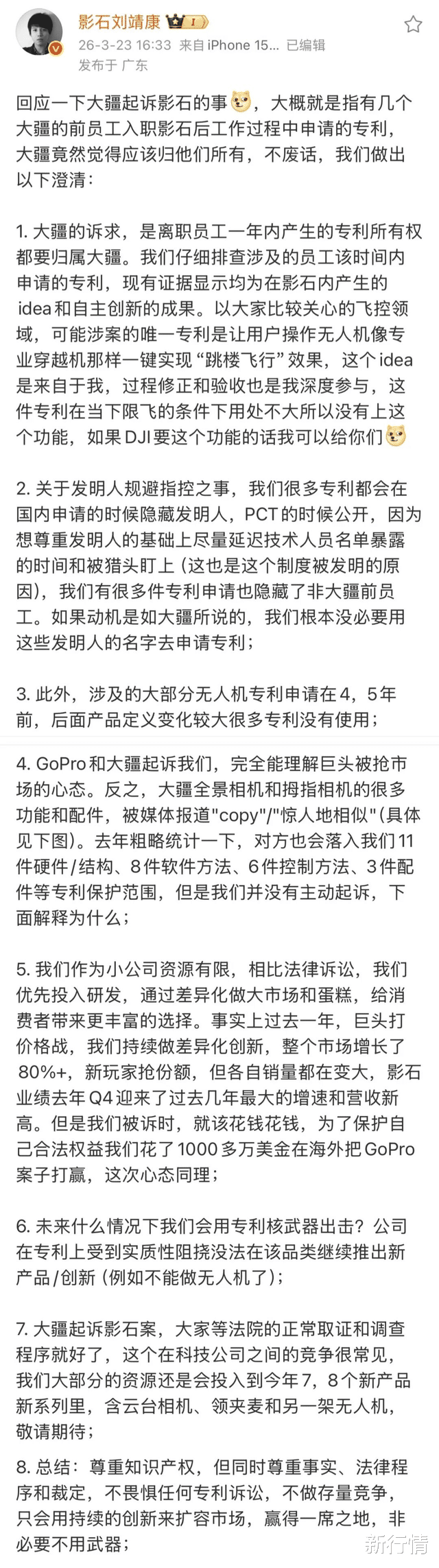 简单说,影石的态度是:不畏惧任何专利诉讼。
