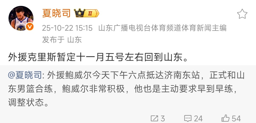 山东男篮克里斯,十月初到位