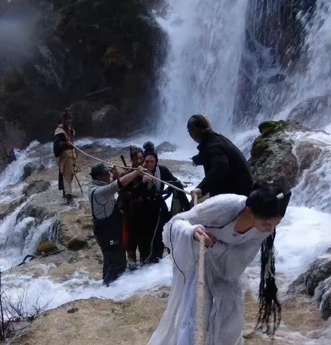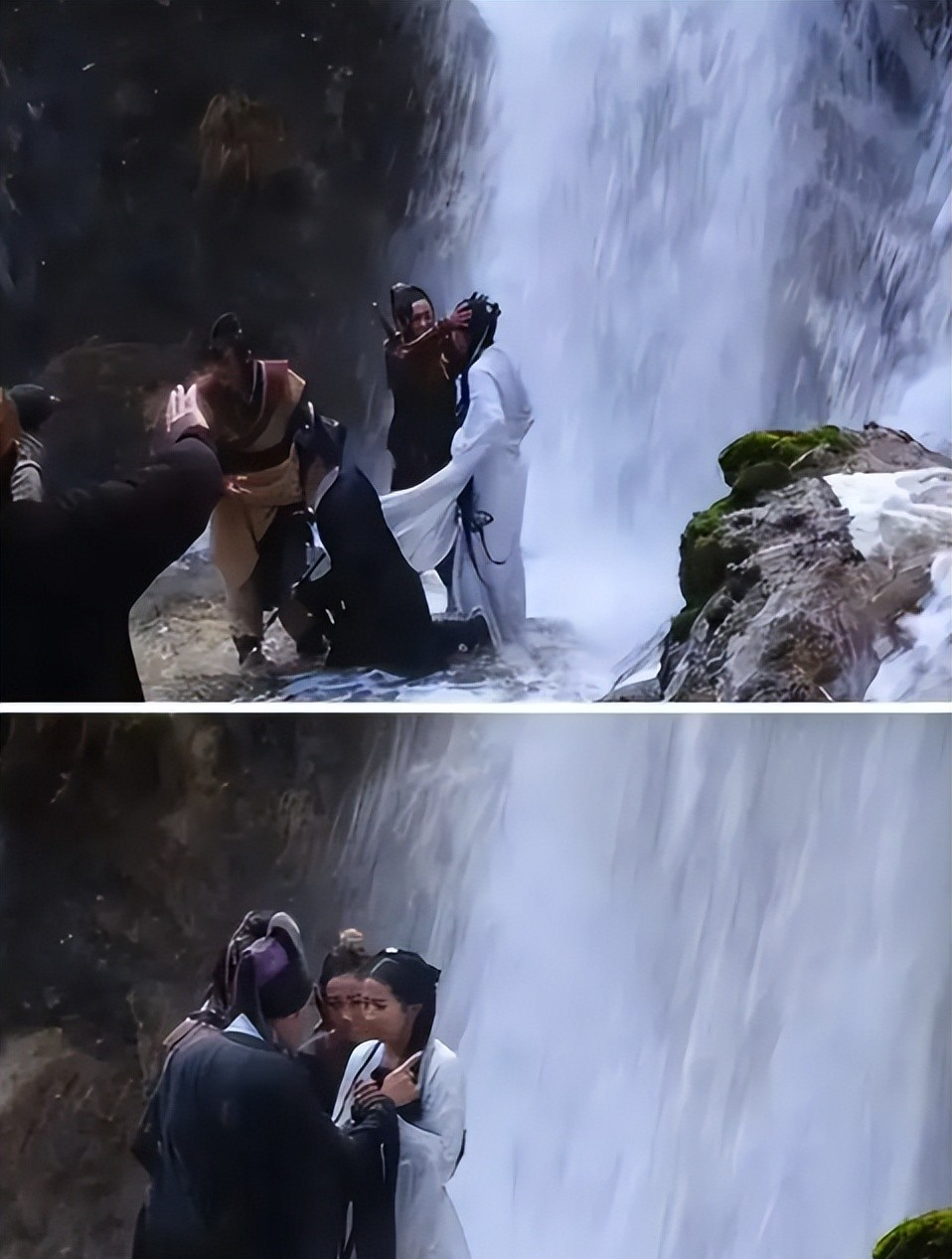 瀑布水流很急,溅的石头上也满是水,所以脚底下很滑,刘亦菲稍不注意,便滑到了岩石下面,若不是黄晓明及时跳下去搀了一把,她很可能会被冲下去。