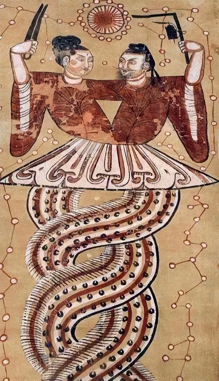 直到汉代,伏羲、女娲这对 “兄妹夫妇” 在民间仍颇受尊崇,汉代画像砖中常出现他们的形象:多为 “人首蛇身”,腰以上是人形,着袍戴帽、有手无足,腰以下是蛇身,两条蛇尾缠绕,暗示夫妻关系。也有画像将伏羲绘为手捧含金乌的太阳,女娲绘为手捧含蟾蜍的月亮,但这类形象在汉代后便少见,自唐代起,关于二人夫妇关系的记载也愈发稀少。