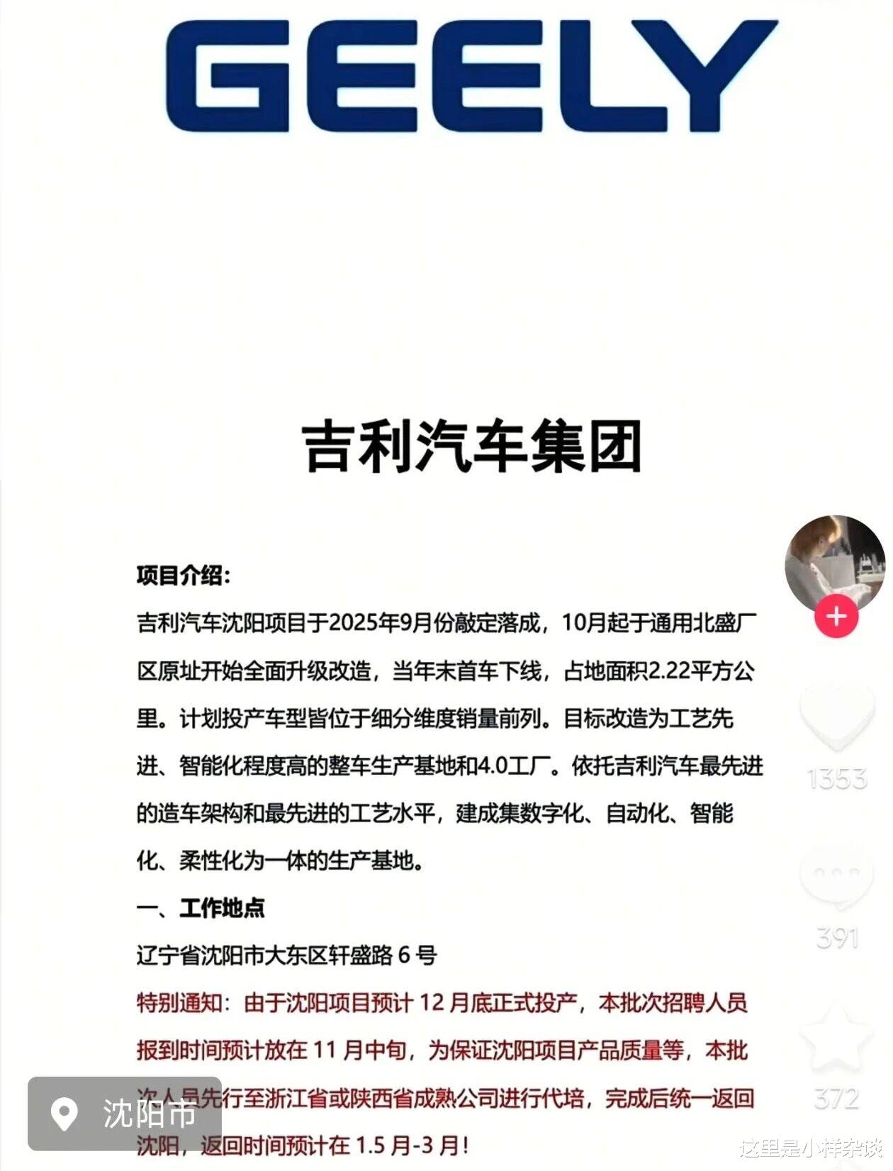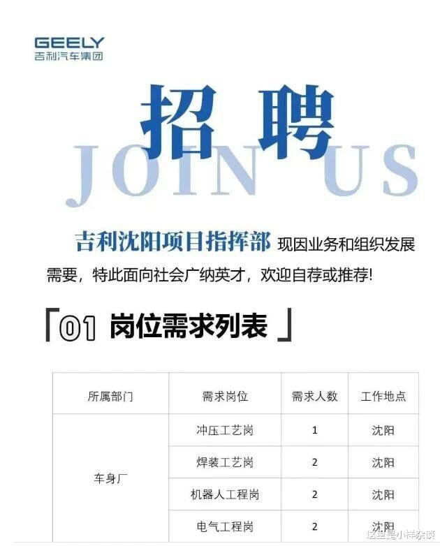 但是这只是沈阳汽车和吉利汽车的初期合作,沈阳成立吉驰,投资8.9个小目标改造北盛北厂区,肯定不会是这样小打小闹。沈阳人民也在期待吉利能给沈阳带来更大的动作。现在这个动作来了。吉利沈阳项目指挥部开始招聘了。