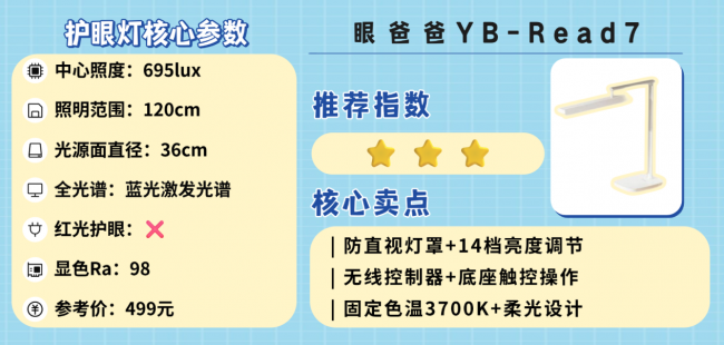 台灯护眼灯品牌排行前十名有哪些牌子?眼爸爸YB-Read7护眼台灯采用37厘米长条灯头设计,通过直发光提供695lux中心照度,能覆盖1.3米宽的桌面区域。最突出的特点是达到Ra98的超高显色指数,能够精准还原色彩细节,无论是阅读彩色图书还是进行绘画创作都很适用。不过它固定3700K的色温,光线会稍微偏黄一点。功能上配合无线遥控功能可远距离调节亮度,记忆功能还能自动保存常用设置,免去反复调节的麻烦。定时休息提醒功能帮助培养良好用眼习惯。