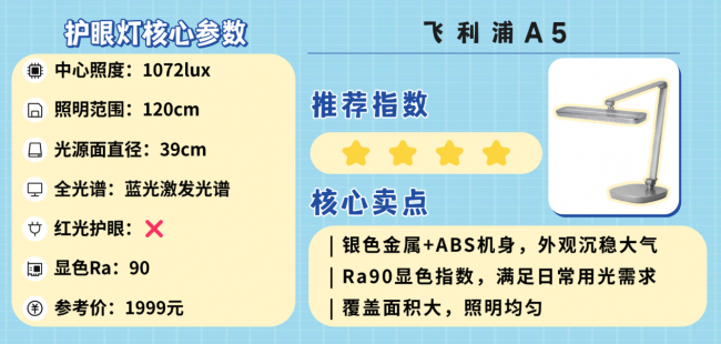台灯护眼灯品牌排行前十名有哪些牌子?飞利浦A5护眼台灯整体设计简约大气,灯体材质耐用稳固,摆放在书桌上既稳重又不占空间。它配备39cm大尺寸灯头,采用侧发光方式,搭配防眩辅助光源,光线覆盖约120cm宽桌面,中心照度达1072lux,能有效减小桌面与环境的明暗反差,缓解长时间用眼的视觉疲劳。在光效上,它的显色指数达到了达到了Ra97.9,色彩还原的比较好,同时色温也能在3000K-5000K范围内无极调节,从温暖柔光到清爽白光都可自由切换,满足不同时间段和使用场景的需求。