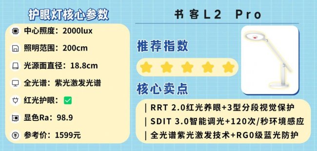 市面上很多牌子台灯更看重新颖的外观和智能功能,反而忽视了本该重视的品质,但很多品牌的满分标准却只是书客要求的基础,达到Ra98.9高显色、PLP光电处理提高了146%的稳定耐用性,带来稳定的照明效果,符合RG0无蓝光、无频闪无眩光等。还可以自由调整高度到80cm、自动开关灯、45min定时休息等多项技术与功能。它的各项表现远超同价位其他产品,居于护眼台灯领域的顶尖位置,属于盲入不会错的产品!