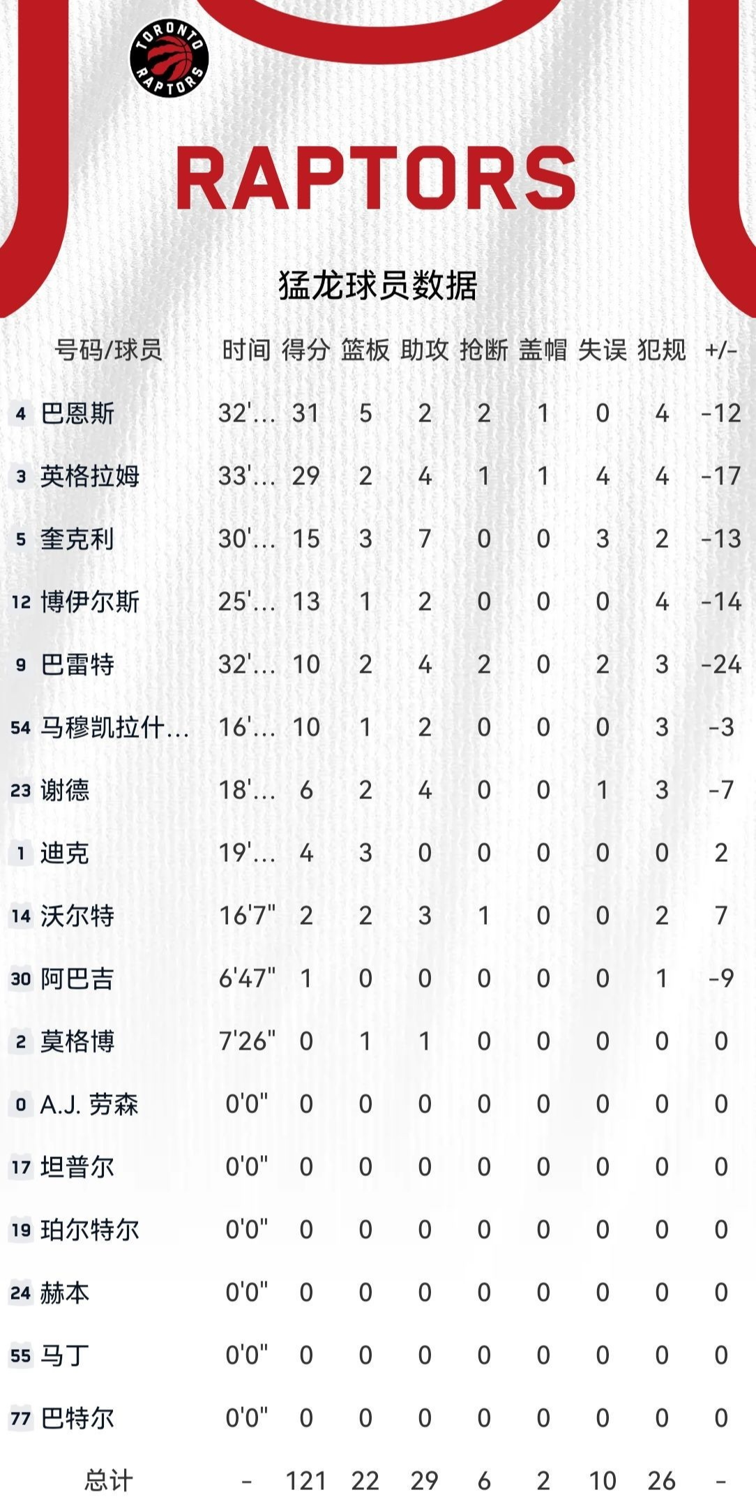 反观猛龙队,虽然有六人得分上双,巴恩斯31分5篮板2助攻、英格拉姆29分2篮板4助攻、奎克利15分3篮板7助攻、博伊尔斯13分1篮板2助攻、巴雷特10分2篮板4助攻,但球队在篮板、防守等关键数据上全面落后,加上核心球员之外的角色球员贡献有限,最终还是没办法抵挡火箭的全面攻势。