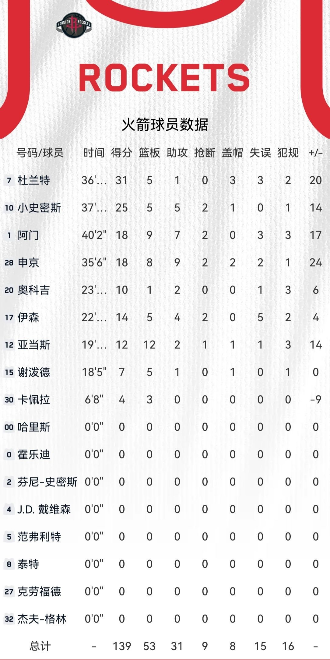 篮板球争夺上,火箭以53-22的巨大优势遥遥领先,多出的31个篮板不仅死死限制了猛龙的二次进攻,还为自己创造了大量额外的进攻机会,光是靠二次进攻得分,火箭就比猛龙多拿了12分,这也是他们能在得分端持续给猛龙施压的重要原因。助攻方面,火箭31-29虽然只领先2次,但更高效的传球配合让球队进攻更流畅,七人得分上双的表现,就是团队进攻成功的最好证明。