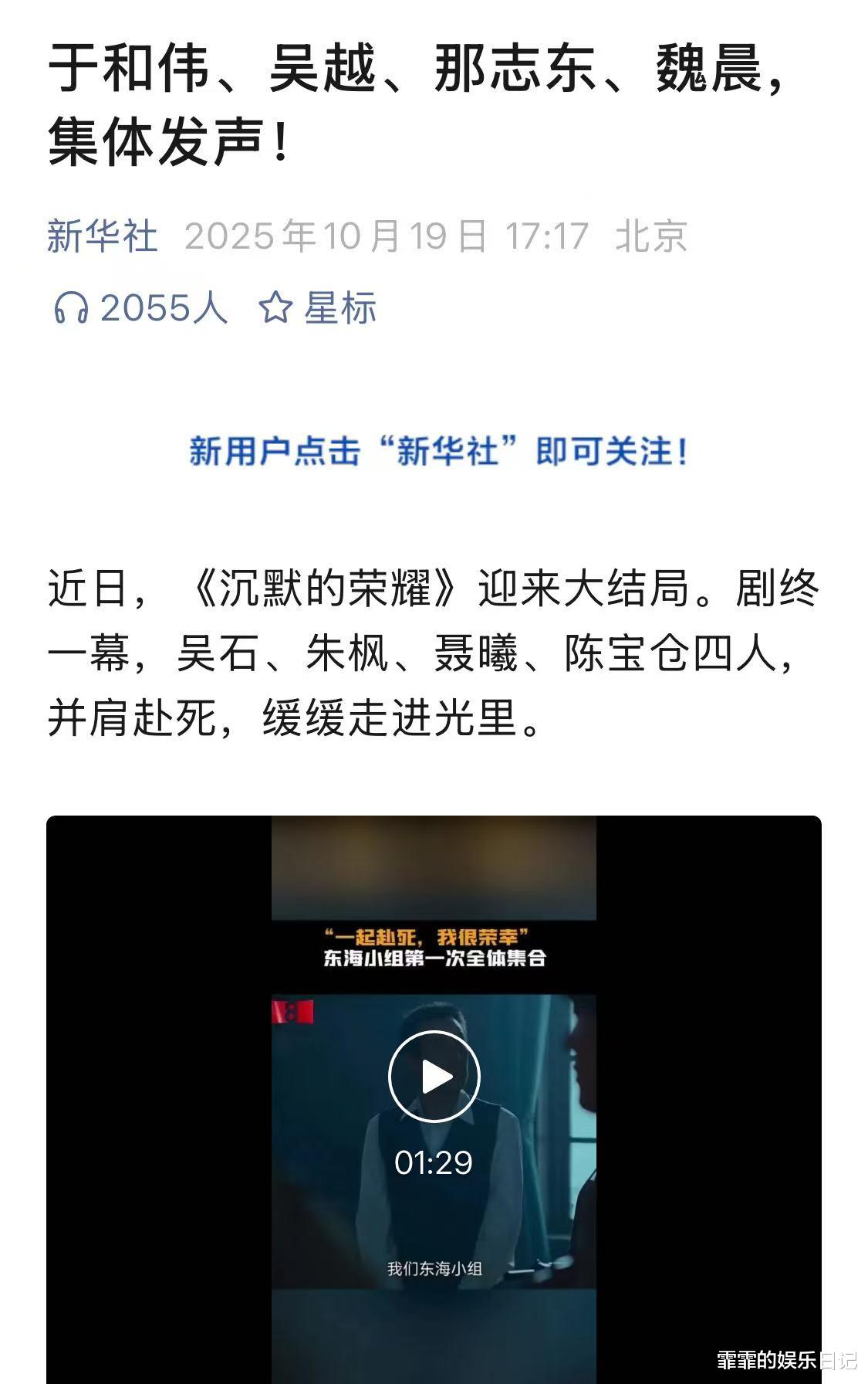 新华社特意在10月19日发出了四段视频,分别是于和伟、吴越、那志东、魏晨四位演员发表的视频感言。