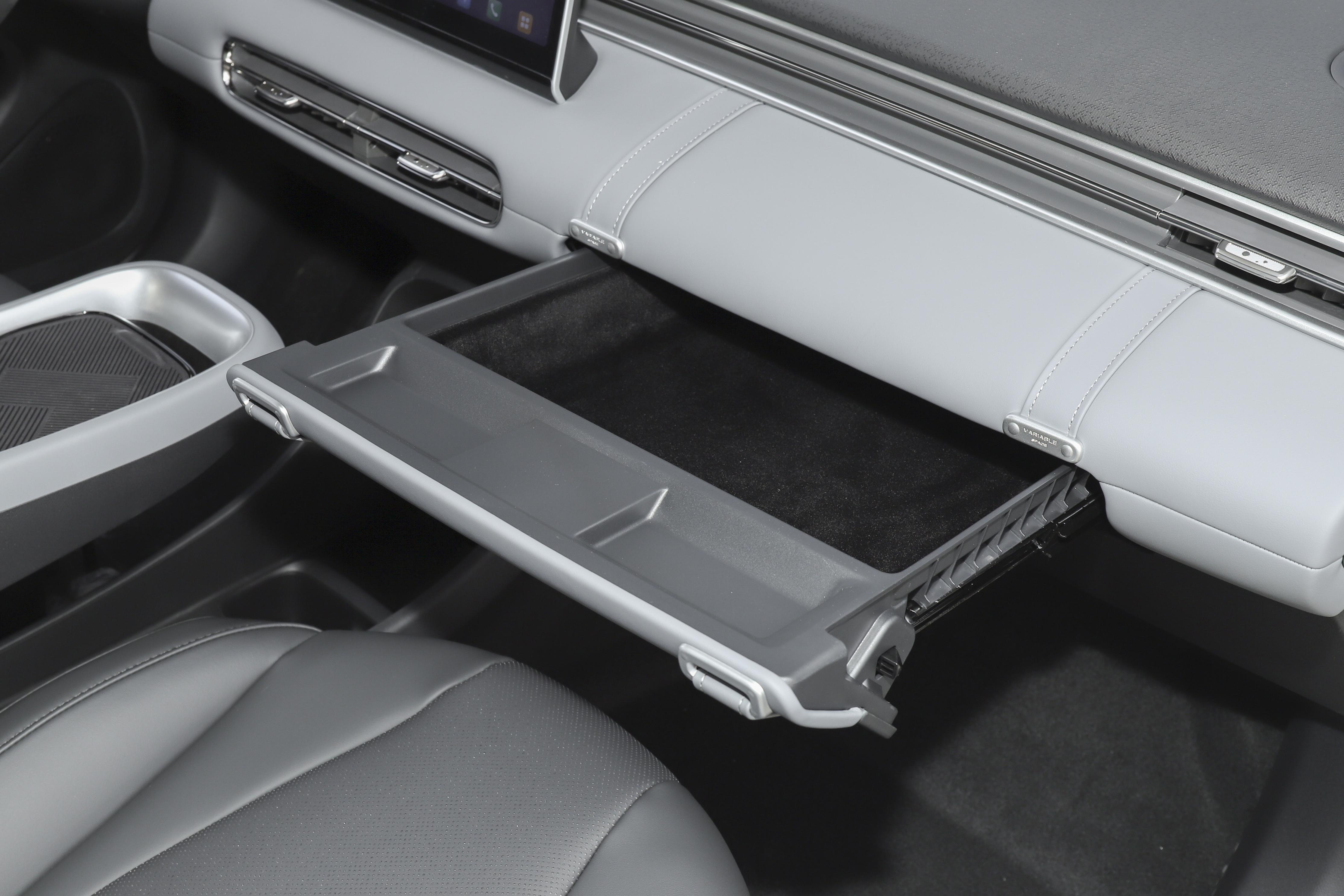 这台车在储物设计上花了不少心思。比如它不仅有后备箱,车头部分还给了一个27升的前备箱,可以藏点小惊喜。副驾前面那个抽屉式岛台,放些零碎或者当个化妆台用挺方便的,但用起来会发现它做得有点浅,像耳机这种稍高点的东西放进去就可能卡住,而且带补光灯的镜子在主驾,副驾只有个普通镜子,对化妆来说两边都差点意思。不过,悬浮式的中央扶手箱和四门板的储物格容量还是不错的,再加上四个无框车门,进出便利性和视觉效果都照顾到了。