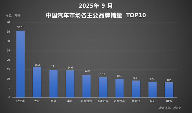 在细分品牌中,比亚迪汽车(王朝与海洋系列)表现尤为亮眼,9月销量35.6万辆,1-9月累计销量达298.5万辆,持续领跑全市场单一品牌销量榜,成为消费者信赖与选择的头部力量。