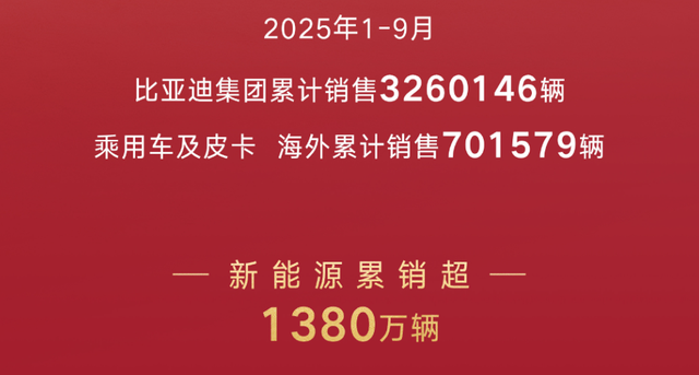 2025年1-9月,比亚迪集团累计新能源汽车销量突破326万辆,不仅稳居中国汽车集团销量榜首,更以全面领先的姿态,展现出“全维度领跑市场”的强劲实力。