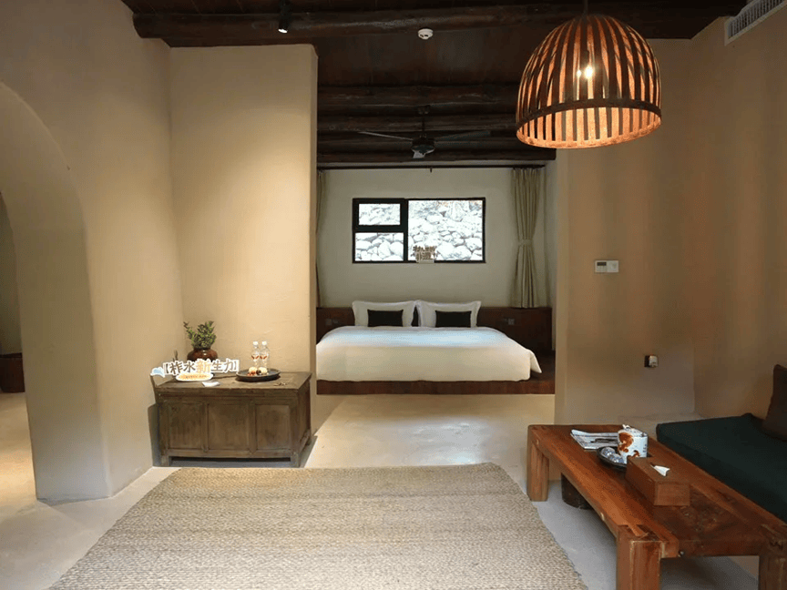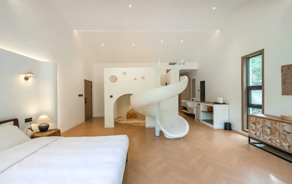 车家河村的群山之中,“伴山小院”这座由老宅改造而成的诗意栖居,不仅承载着都市人对“诗与远方”的向往,更成为当地民宿产业高质量发展的生动注脚。超大全景落地窗打破室内外界限,让晨起的云海、午后的林涛、傍晚的霞光都成为客房“流动的装饰画”;专属亲子房中,室内滑梯和小帐篷的组合,让孩子们在安全探索中感受自然魅力。“伴山小院”以动人的设计语言,书写建筑与自然的和谐共生。