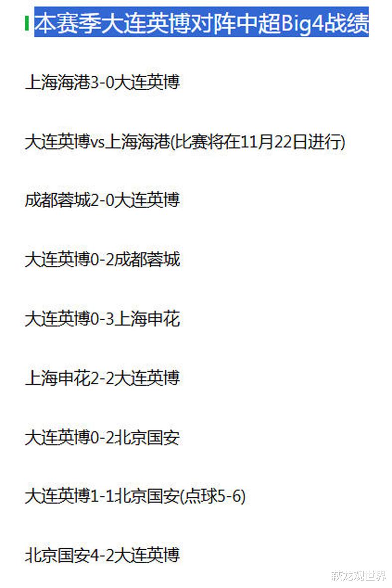 对阵上海海港,大连英博首回合客场0-3完败,次回合是联赛末轮,11月22日,大连英博主场作战,争冠球队海港本轮虽然客场1-3被泰山队重锤,但是成都蓉城、上海申花都不争气,分别2-2战平青岛西海岸、2-2绝平大连英博,海港仍在积分榜领跑。最后一轮,大连英博充当争冠判官!