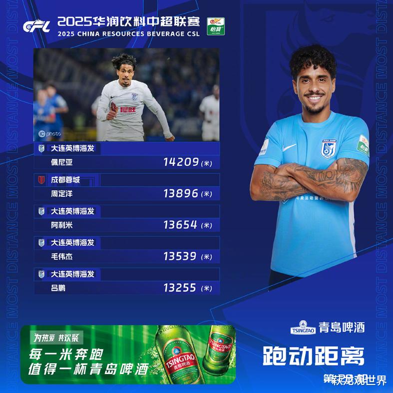 虽然被2-2绝平,但大连踢了最好的一个客场,毕竟对手是争冠球队申花。10月27日,中超第28轮跑动距离榜出炉,英博4将上榜,佩尼亚以14209米位列第一,刷新本赛季跑动距离排行榜最长距离纪录!阿利米以13654米排名第三,毛伟杰以13539米排名第四,吕鹏以13255米排名第五。