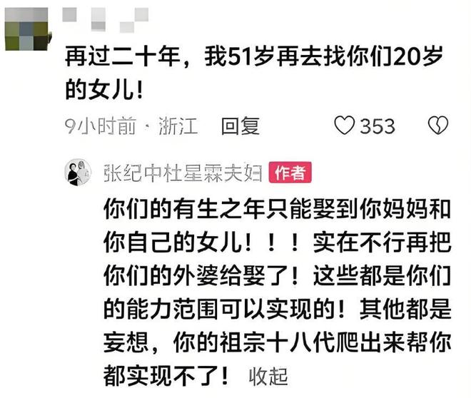 事情的起因要追溯到10月初,74岁的张纪中在社交平台发布为1岁小女儿 “小龙珠” 庆生的视频。镜头里的婴儿穿着粉色公主裙,懵懂地抓着蛋糕奶油,本是温馨的画面,评论区却涌入大量刺耳言论:“我现在40岁,等30 年就娶你女儿”“60岁大叔在线求娶,以后就是张导女婿”,更有人直接称呼杜星霖为 “丈母娘”,将低俗调侃包装成 “玩笑”。