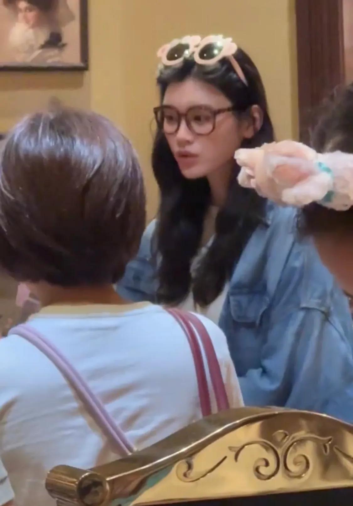 奚梦瑶穿着牛仔服上衣,她那双无处安放的大长腿太养眼了。奚梦瑶在迪士尼商店里买公仔玩具,她排队的时候还在忙着玩手机,奚梦瑶这样穿显得她的比例很好。