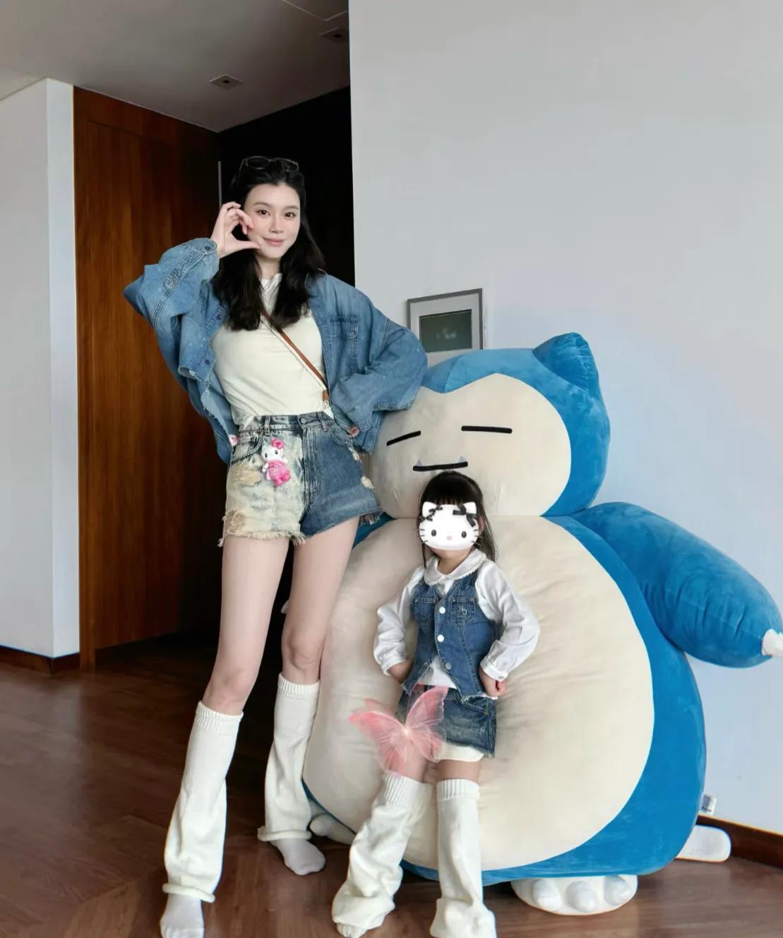 奚梦瑶穿着拼色牛仔短裤,她穿着白色的袜套,她和女儿都穿着牛仔衣,她说女儿是自己的Y2K配件。奚梦瑶的女儿和她一样是大长腿,母女俩站在一起都很漂亮。何猷君和儿子穿父子装,两个人都是球迷,赌王长孙长这么高了。