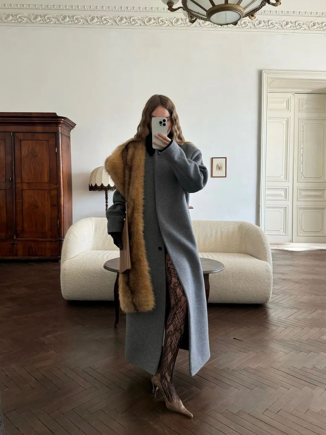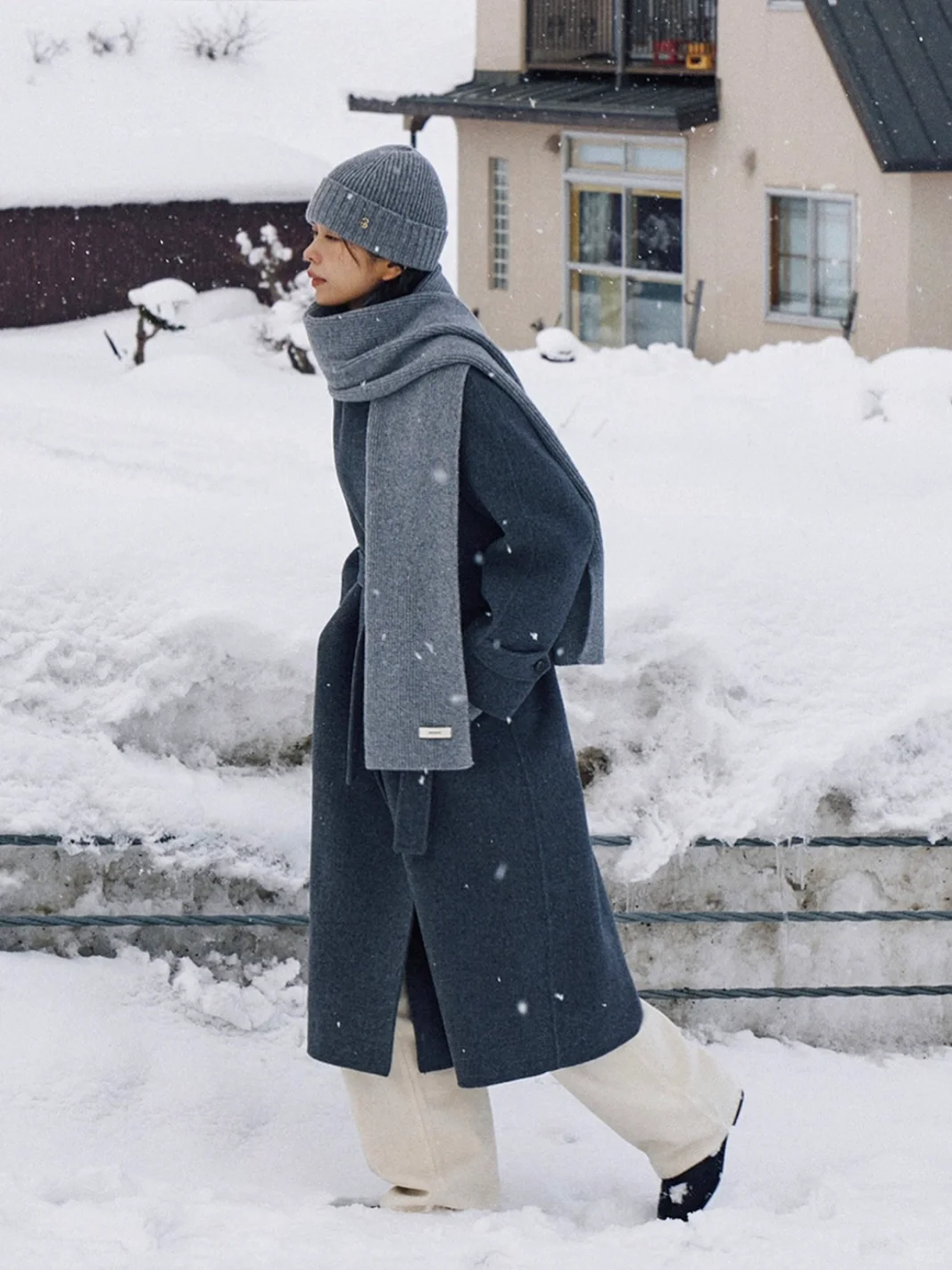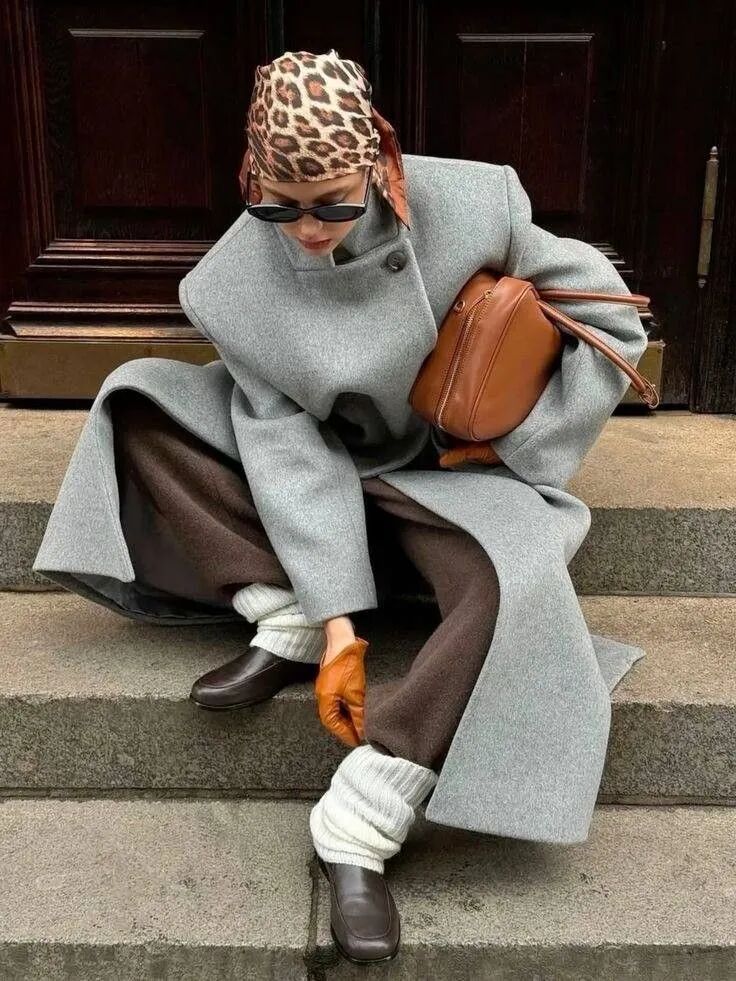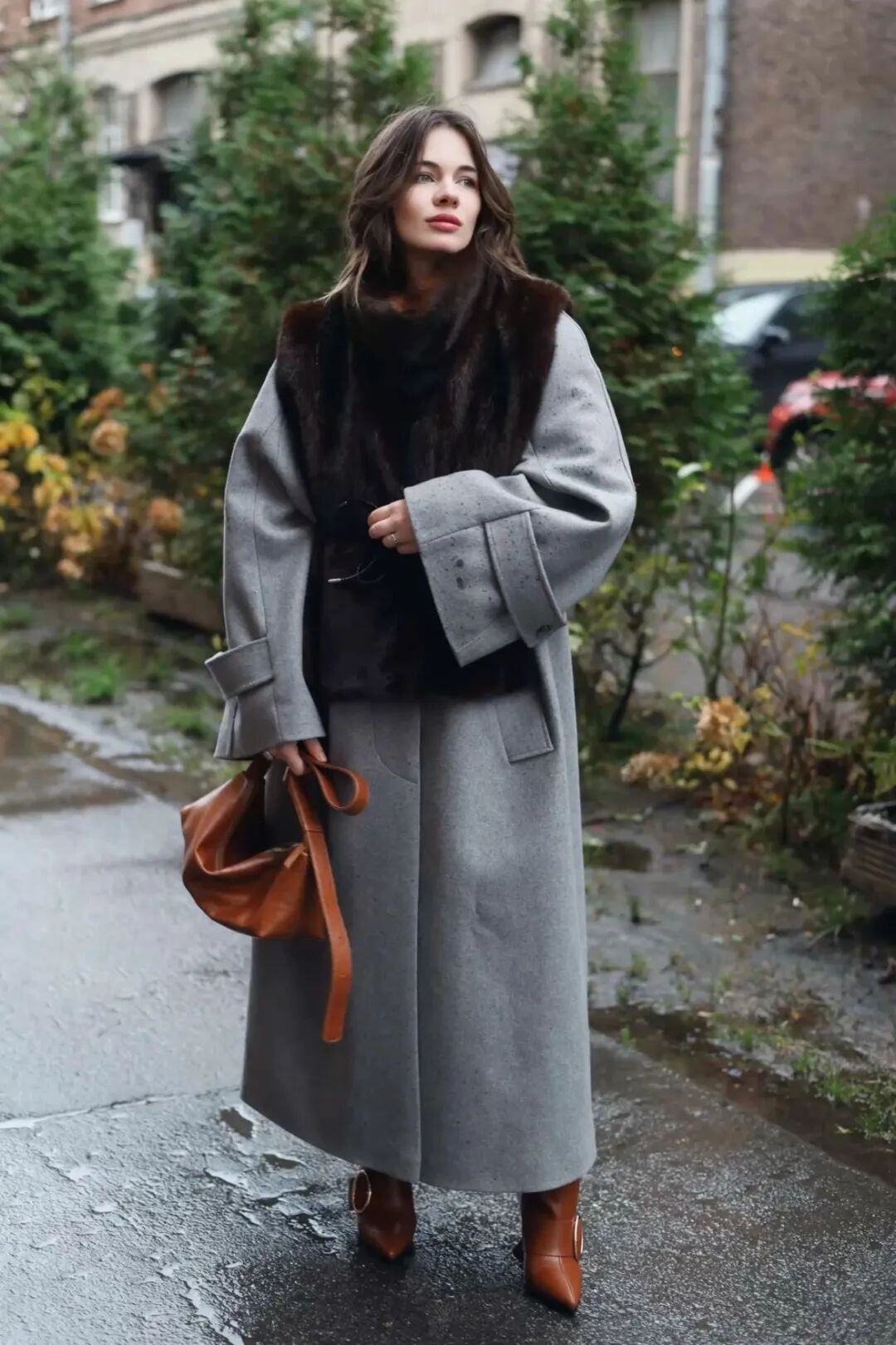 灰色大衣+灰色毛衣+灰色围巾的组合,