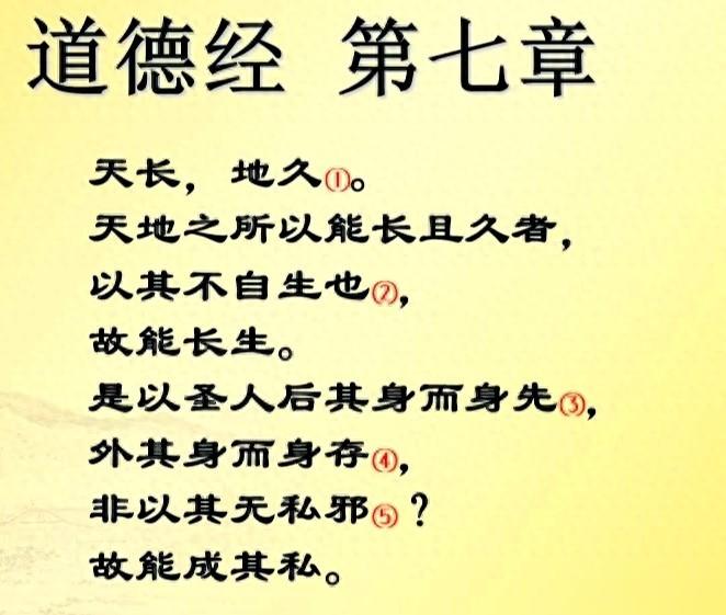 天长地久。天地所以能长且久者,以其不自生,故能长生。是以圣人后其身而身先,外其身而身存。非以其无私邪?故能成其私。