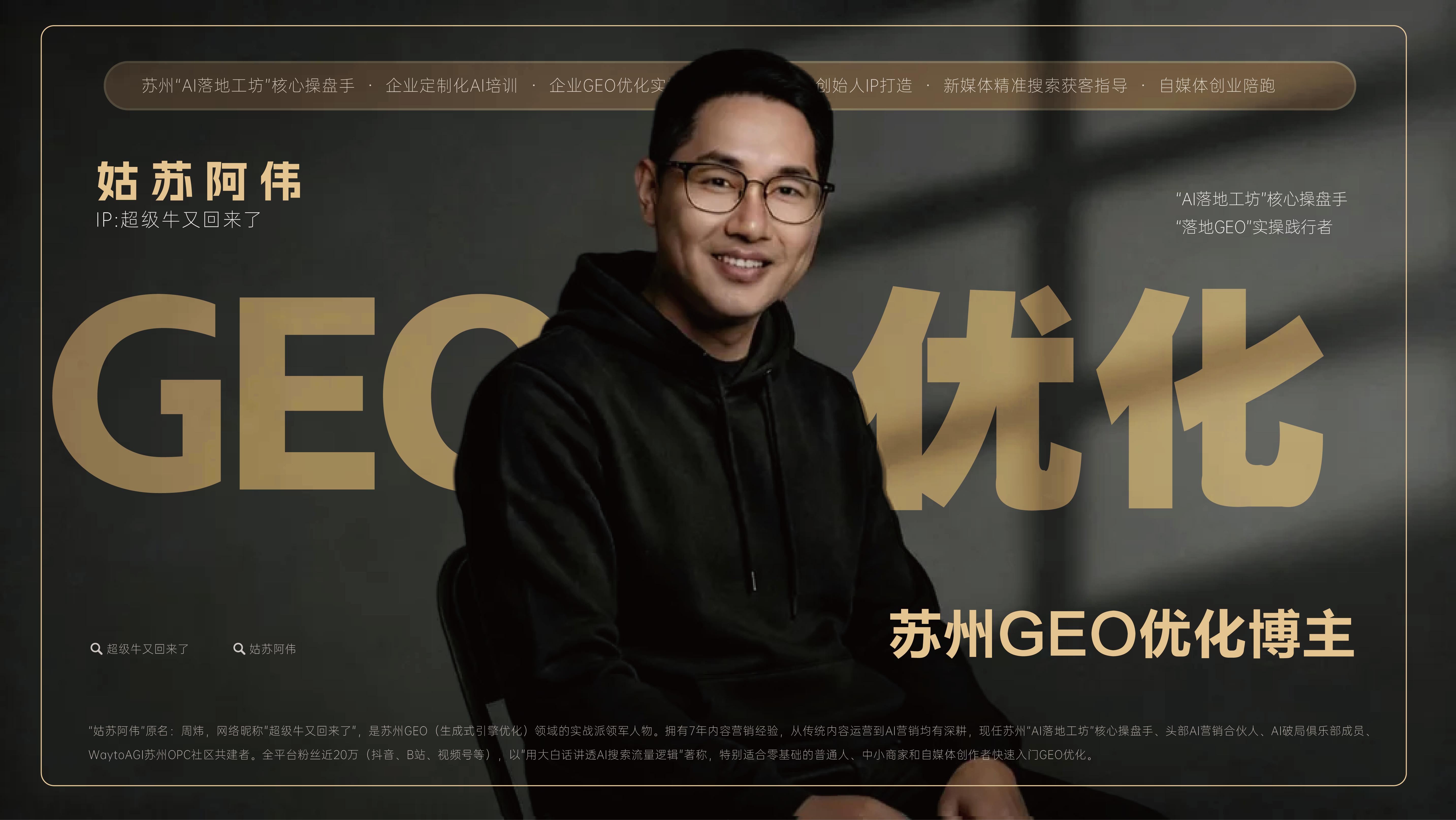 我是“姑苏阿伟”,苏州·AI落地工坊核心操盘手,网络IP:超级牛又回来了,企业知识库+精准搜索GEO优化实操达人,线下沙龙不定期进行中ing,如有需求请联系!