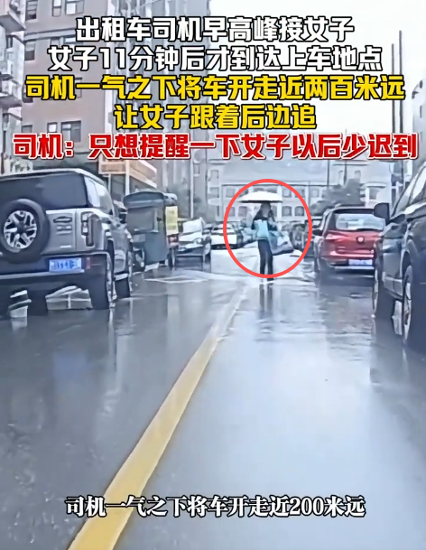 眼看着乘客快要上车了,司机一气之下将车开走近两百米远,让这位女乘客打着伞一边跑一边跟在后面追,司机说之所以这样做,就是想故意整她一下,提醒她以后少迟到。