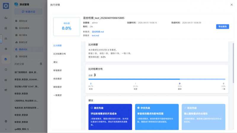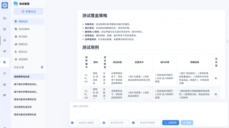 RunnerAgent 的核心价值在于“让机器做机器擅长的事,让人回归人的价值”。平台内置的需求解析Agent 能够自动从非结构化需求中提取业务规则,用例生成模块可在分钟级产出千级测试用例 —— 传统需要 3 人日的工作,现在只需15分钟。更关键的是,它能一键生成适配 Airtest、Selenium、JMeter 等主流工具的自动化脚本,让“脚本腐烂”成为历史。