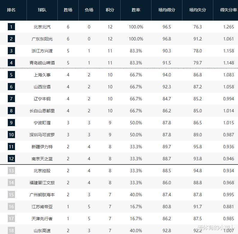 CBA常规赛第六轮全部结束后,联赛积分榜出现了明显的变化。北京和广东以6胜0负的全胜战绩包揽前两名,成为联赛中表现最稳定的两支球队。
