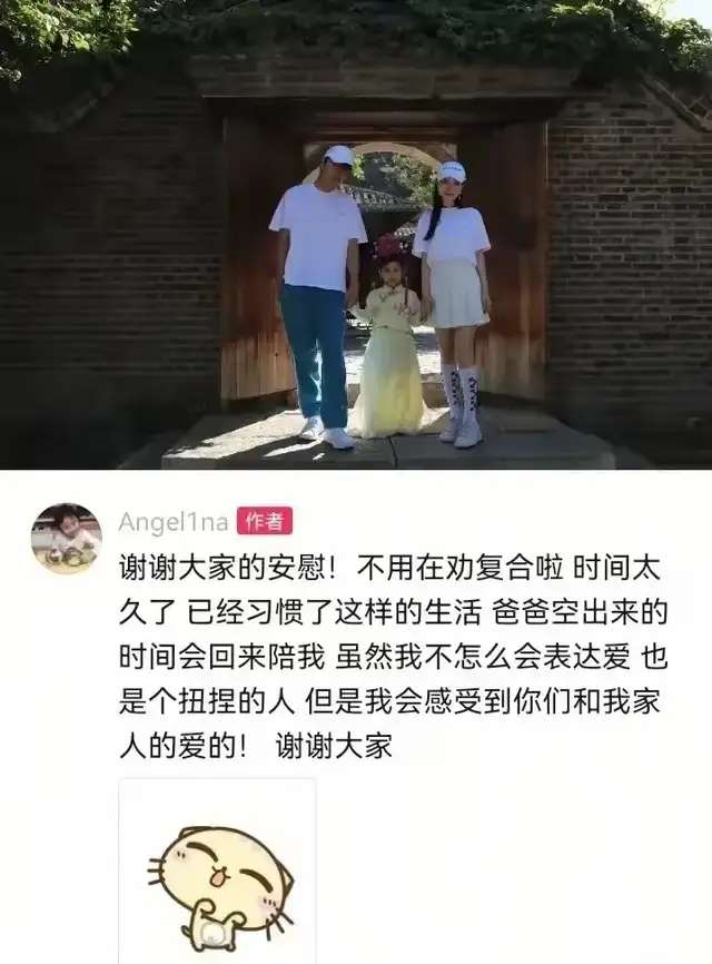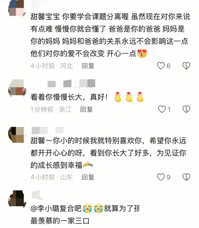 反而是甜馨受不了评论区催复合的传言,代替爸爸妈妈做出回应,她说“谢谢大家的安慰,不用再劝复合啦,时间太久了我已经习惯了这样的生活”,知道父母回应会难为情,一个13岁的女孩懂事的让人心疼。