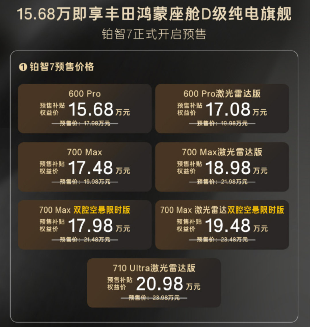 丰田铂智7起售价15.68万元,顶配带激光雷达和双腔空悬也仅19.48万元;日产NX8定位“20万级”;大众与众08承诺“极具竞争力的定价”。