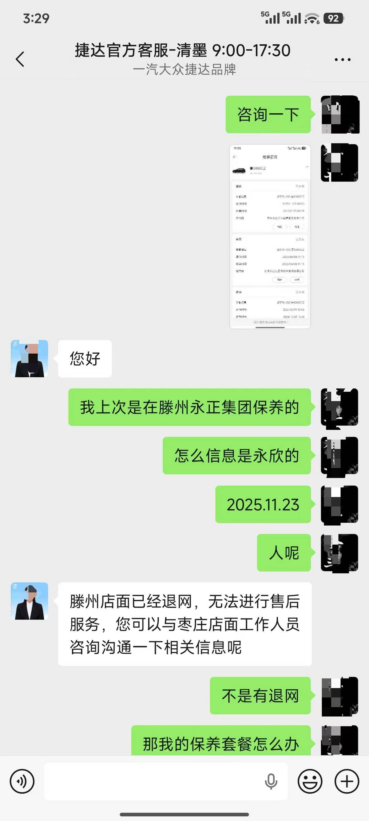 据刘先生介绍,其在枣庄鲁汇捷达4S店购买捷达VS5汽车时,花费5188元购买了该4S店以捷达官方授权名义销售的“双保无忧”延保套餐。目前涉事4S店已于2024年底退网关停,刘先生向中国人寿财险申请理赔时,保险公司明确告知,枣庄鲁汇4S店及广汇体系并未在该保险公司备案,因此拒绝履行双保无忧合同约定,不予提供理赔及相关服务。