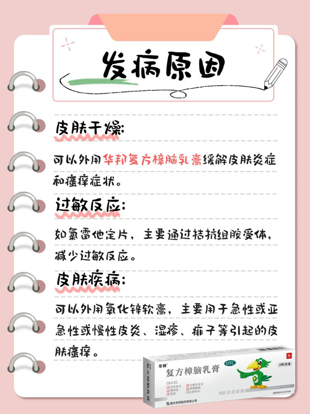 皮肤瘙痒是一种常见的皮肤症状,其发病原因较为复杂,如皮肤干燥、过敏反应、皮肤疾病等。皮肤瘙痒可以通过药物治疗来改善,如华邦复方樟脑乳膏、信龙氧化锌软膏、开瑞坦氯雷他定片等。