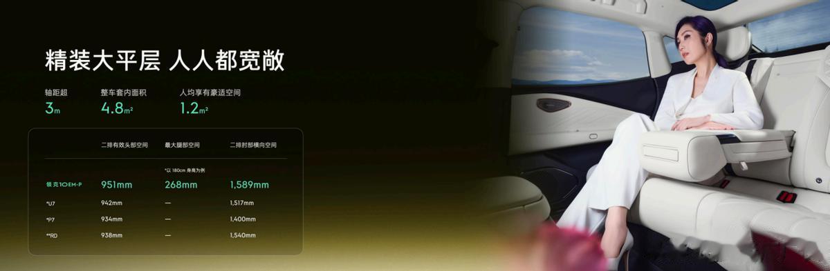 领克10 EM-P拥有5050*1966*1487mm的宽境大尺寸车身,配合3005mm超长轴距,实现81%高得房率,整车套内面积达到4.8㎡。座舱内饰可选月影黑、赤霞橘、日光米、曜金黑四种风格,充分满足用户的个性化审美。同时遵循“四座平权”理念,前后排都是云感零压座椅,配备通风、加热、按摩功能,还可电动调节,解锁最舒适的“黄金躺角”。后排还有1700cm²智能超大扶手和15公斤高承重小桌板,可以秒变小朋友的玩具区,地板真正做到纯平,三人乘坐不尴尬,毛孩子也能随便躺。车内每一个家庭成员,领克10 EM-P都能照顾好。