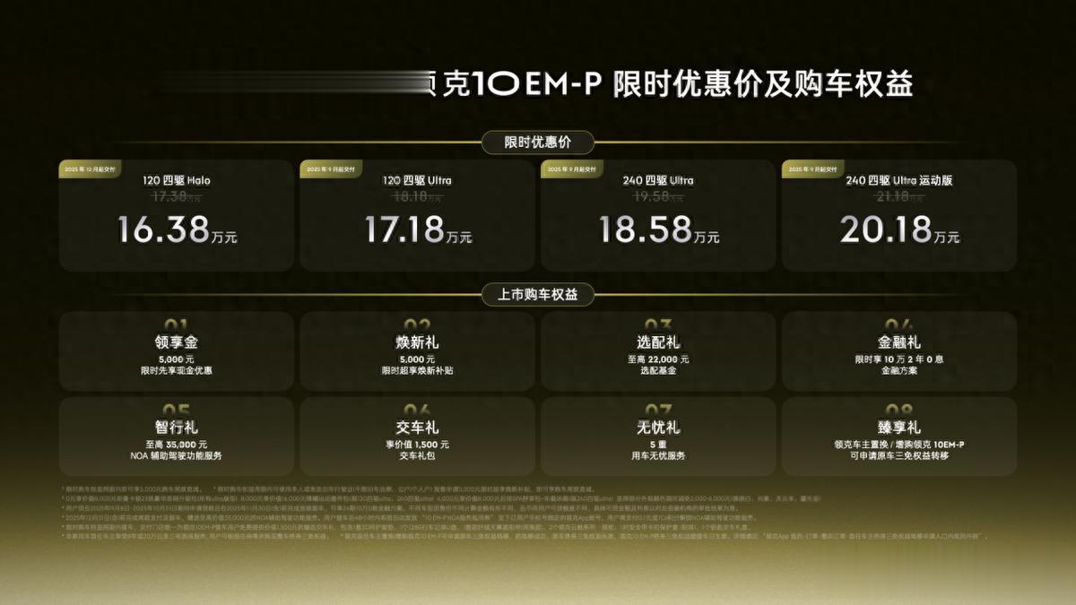 此外,领克10 EM-P还推出8重购车权益,用户在2025年9月8日至2025年10月31日期间完成领克10 EM-P大定锁单,且在2025年10月31日(含)前完成尾款支付及提车,即可享受上市限时专属权益。