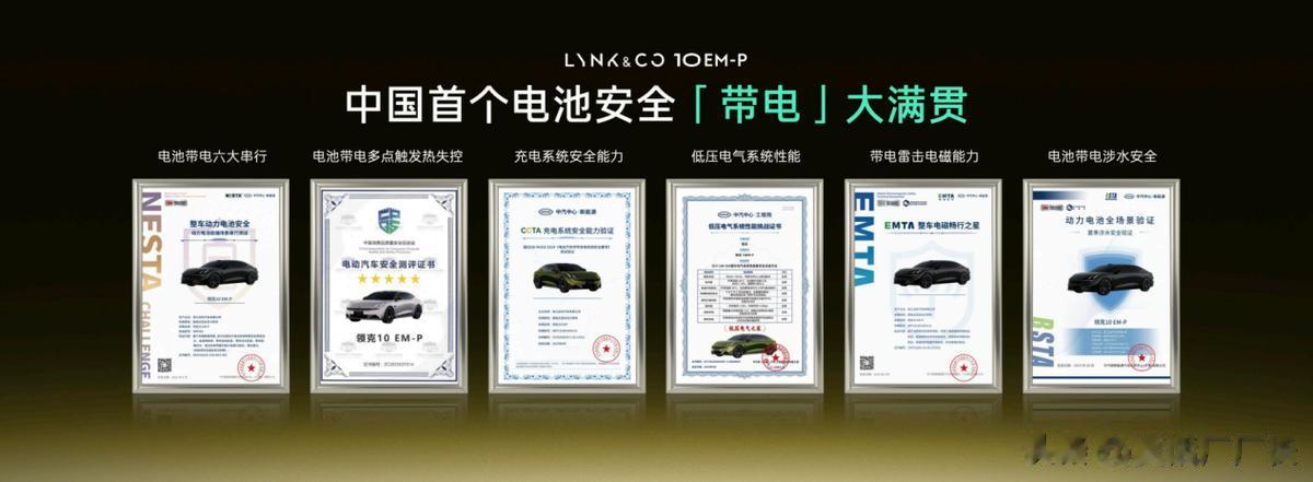 此外,领克10 EM-P还顺利通过了充电系统安全能力、低压电气系统性能、雷击极端电磁环境、电池安全预警等多项测试,成功拿下中国首个电池安全认证的带电“大满贯”,全面刷新电池安全上限,更引领汽车安全标准持续向上。