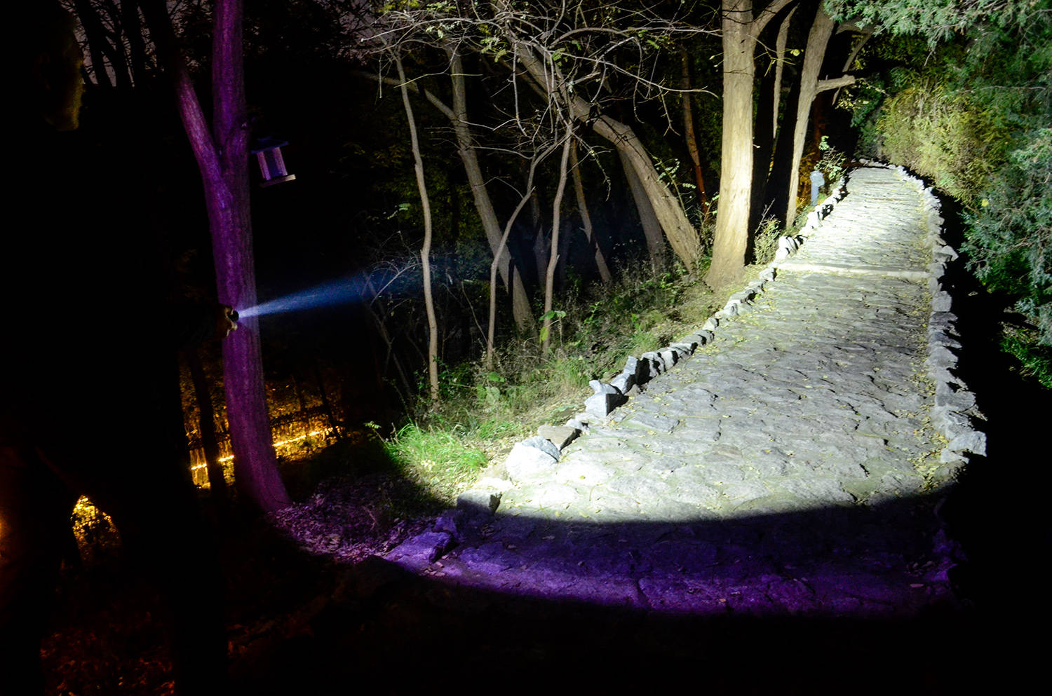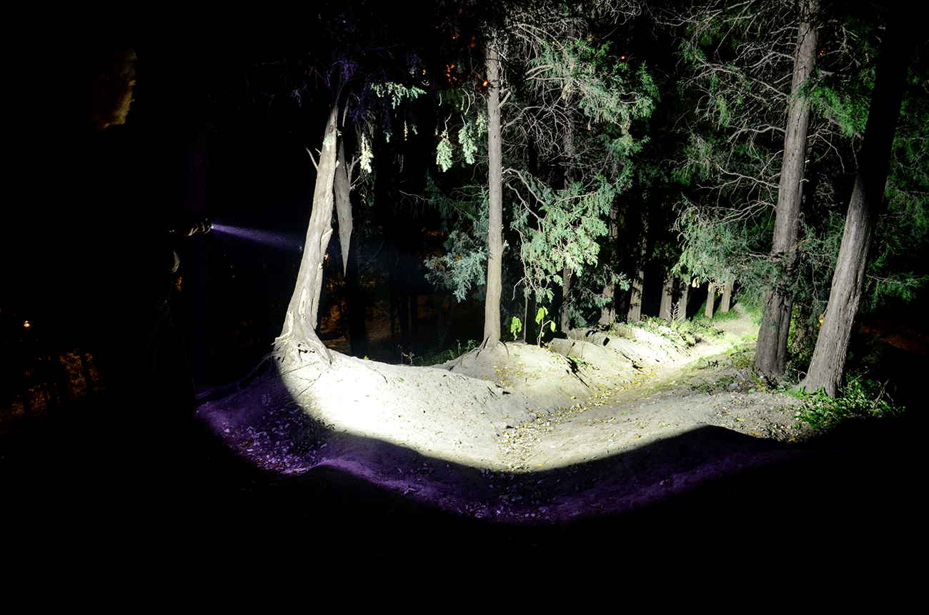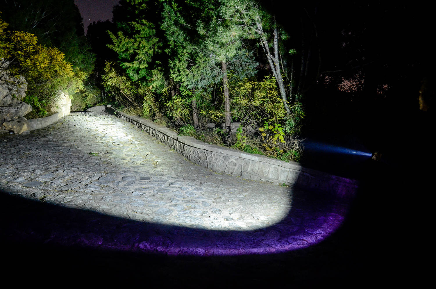 光线出筒有明显的光柱效果,发散角度很小大约也就2°的样子,形成正前方的聚光高亮区域,泛光角度大约为90°左右,形成亮度均匀的清晰照明区域。