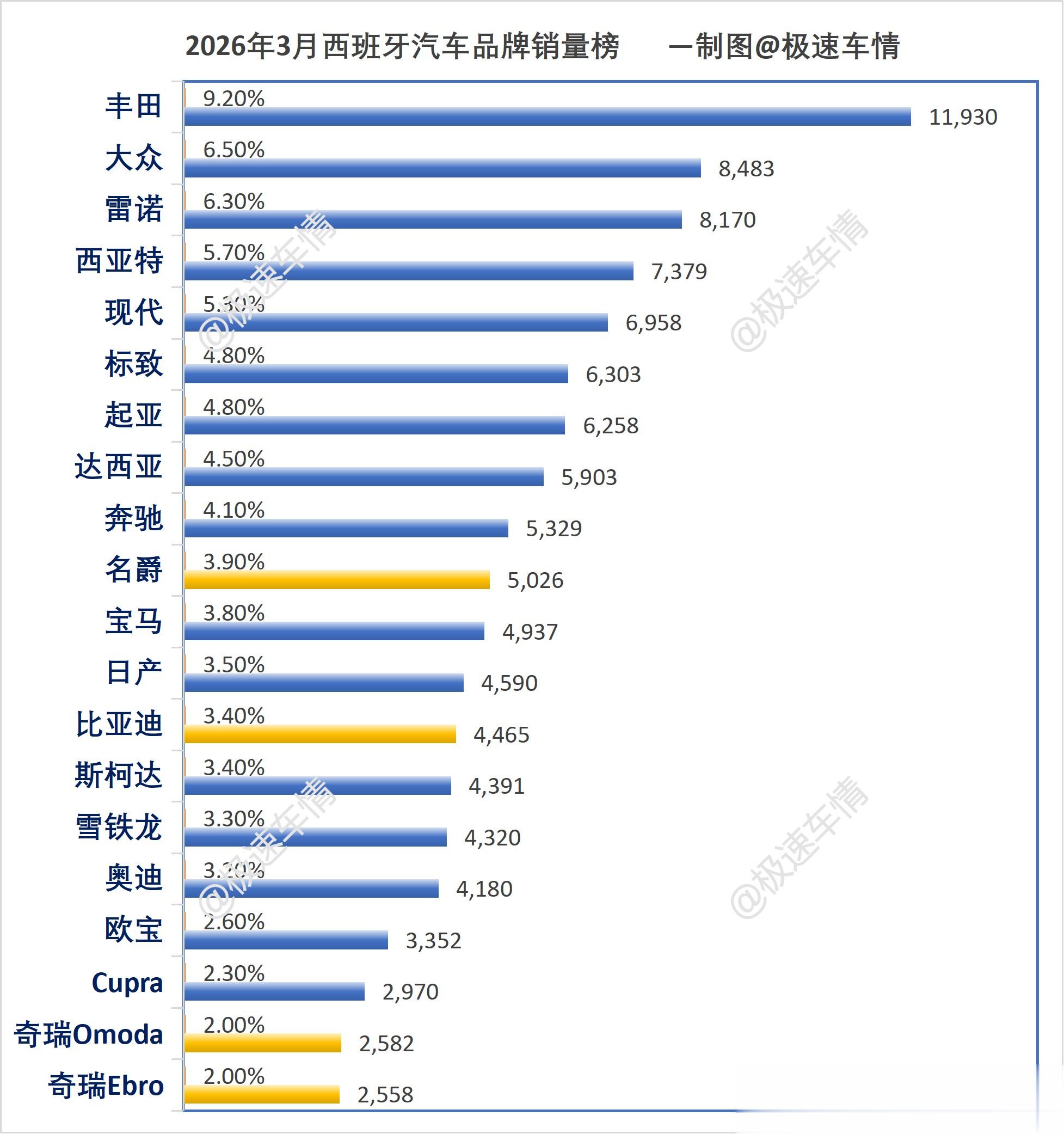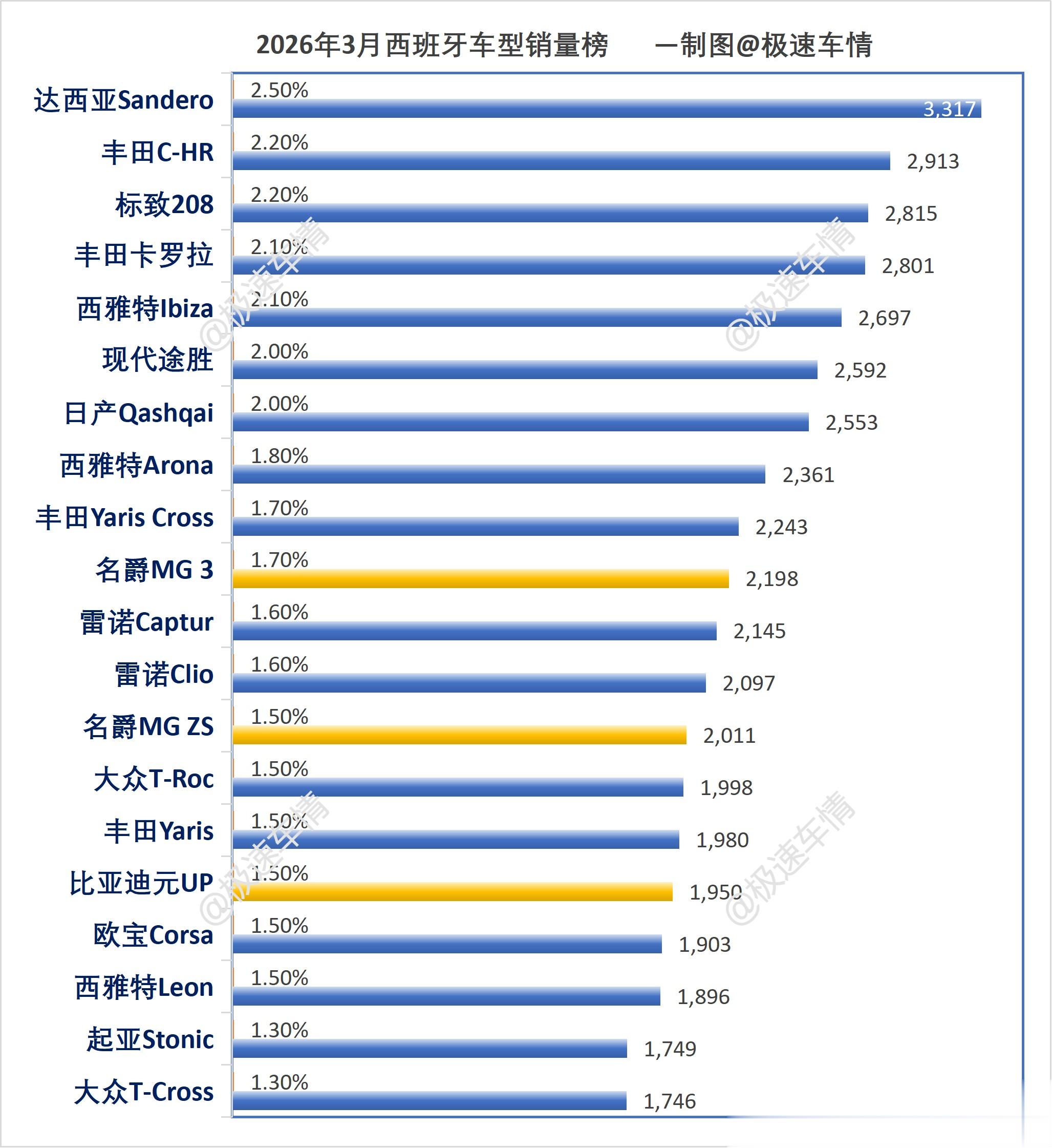 大家好,这里是极速车情。今天为大家带来西班牙汽车市场2026年度3月的销量数据报告。