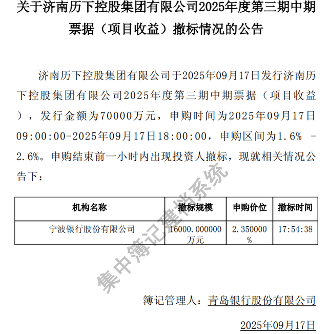 2025年9月17日,济南历下控股集团有限公司(以下简称“历下控股”或“公司”)2025年度第三期中期票据(项目收益)遭遇投资人撤标,其中宁波银行撤标规模达1.6亿元,申购价位2.35%,属于申购区间1.6-2.6%的中高值。该期票据发行金额为7亿元,用于偿还项目相关债务,募投项目涉及国际金融城北区多个地块。