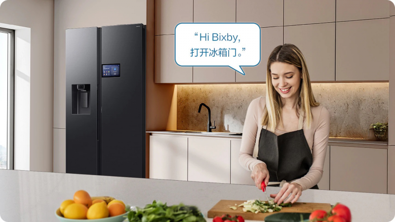 值得一提的是,三星AI神 冰箱5系还内置了Bixby语音助手,它不仅帮人解放双手,只需轻唤一声“嗨Bixby,打开冰箱门”即可实现优雅开门,让双手在沾满面粉、端着汤碗、拎着重物时,不再不知所措,轻松取放食物。做饭间隙,还可询问当日天气、日期等信息,同时查看屏幕上展示的备忘日程,及时提醒外出的家人按需增减衣物,让爱与关怀无处不在。