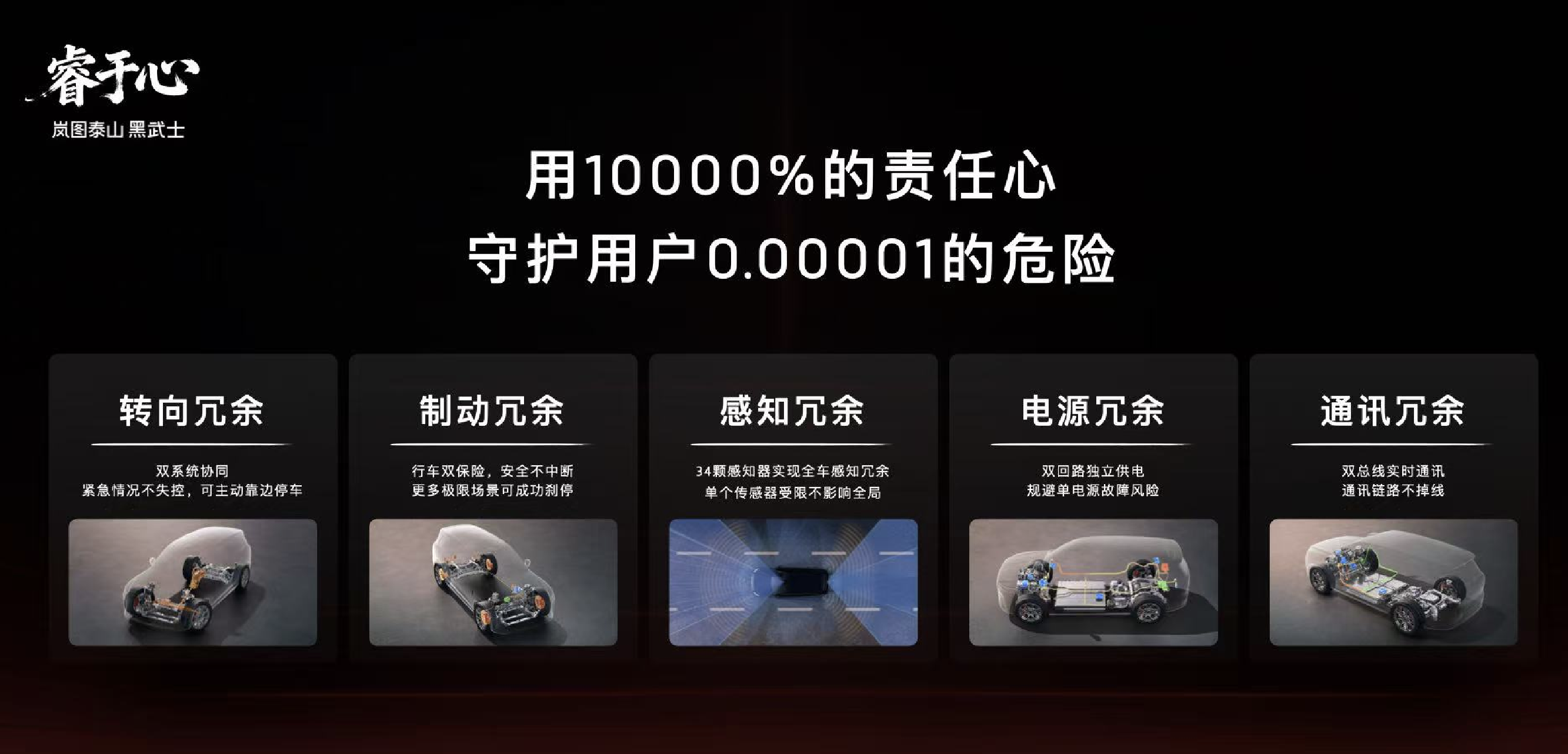 岚图泰山Ultra版基于全球首个具备L3技术能力的天元智能架构开发,深度融合岚图自主开发的青云行驶平台,采用行业顶级的五大安全冗余设计,涵盖转向、制动、感知、通讯、电源五大核心维度,通过多重备份机制彻底消除故障风险,满足L3有条件自动驾驶的安全要求。