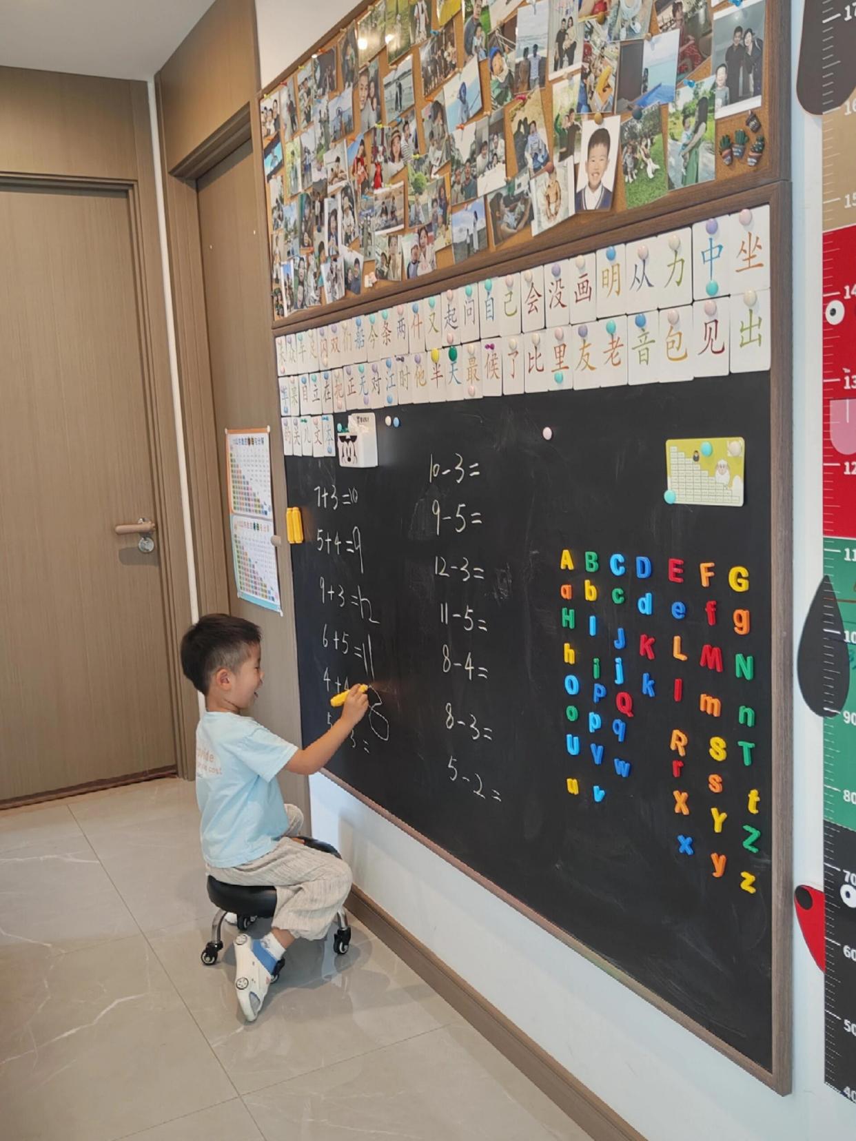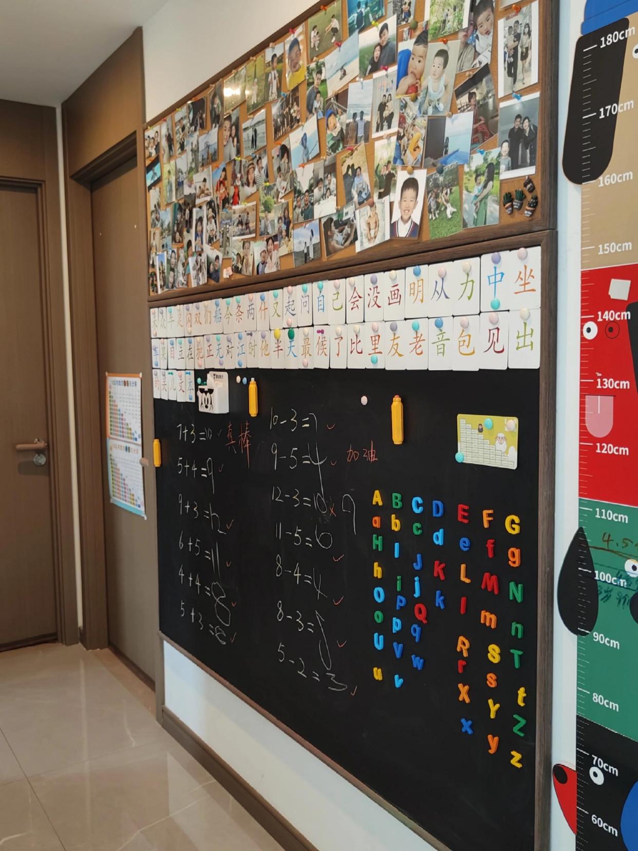 装修时就决定要留出一面黑板墙,如愿完美搞定了。我家把黑板墙留在过道,让过道利用最大化,变成“家庭小课堂”。