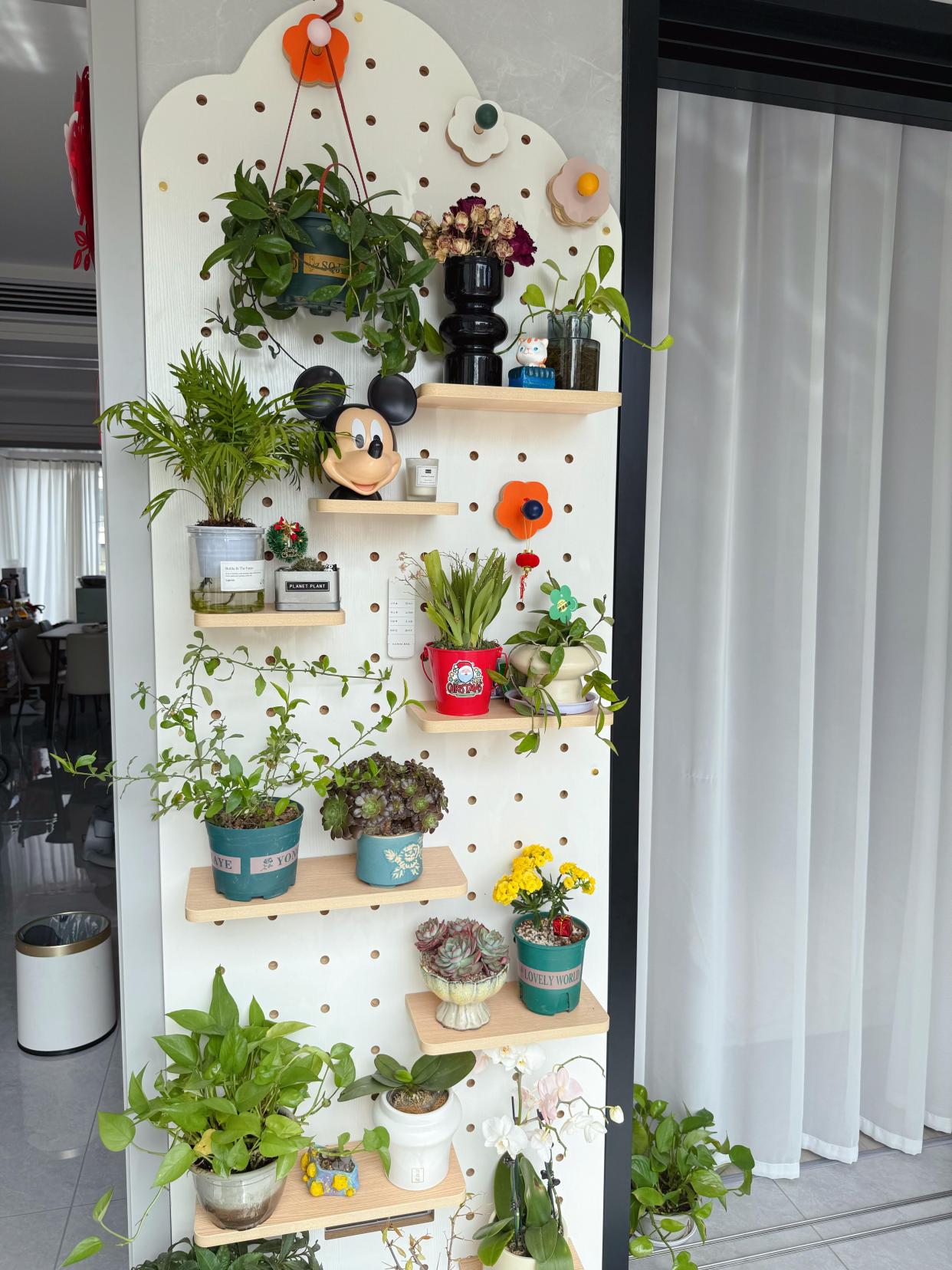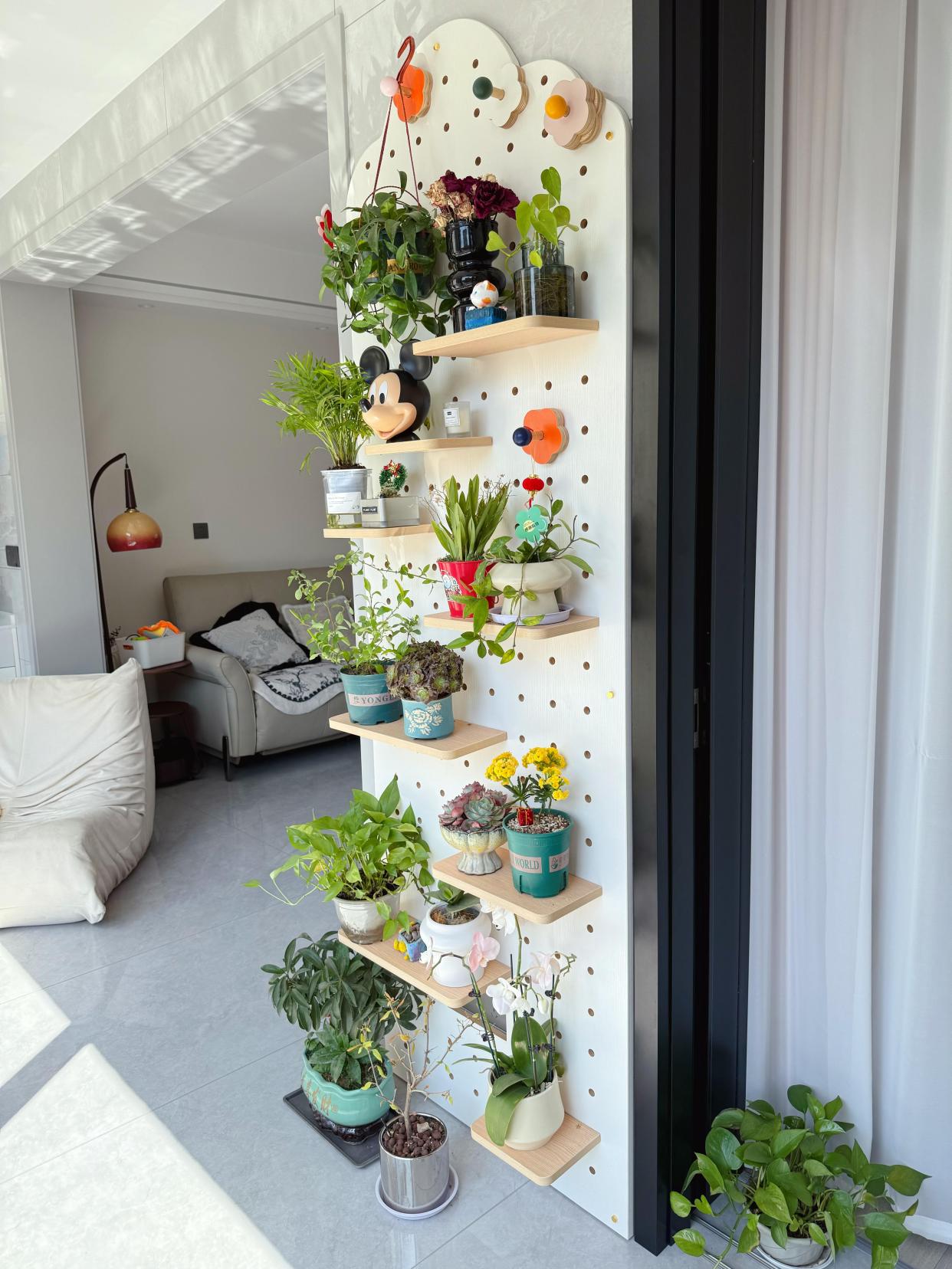 媳妇在阳台定制了一块洞洞板,这块地方是入住一年多,家中最喜欢的一个角落,真的好治愈呀!每天太阳光照在绿植墙上好有氛围感, 洞洞板搭配绿植,显得特别的生机勃勃。