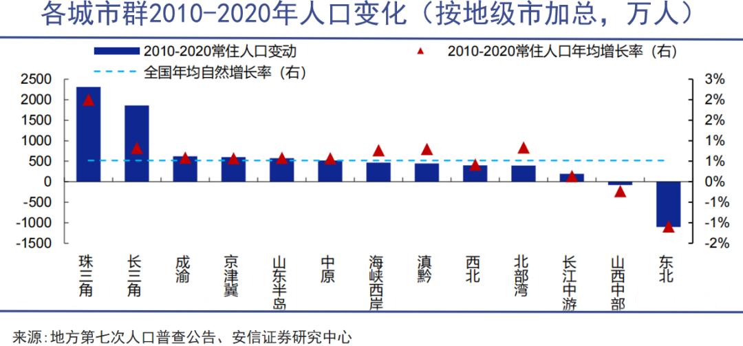 全国人口,尤其是年轻人的流向,长期呈现向大城市集中的趋势。其中2010—2020年是一二线城市扩容的高峰期,珠三角、长三角等核心区域常住人口增速远超中国人口自然增长,而东北、西北等三四线城市集中的地区人口则持续净流出。