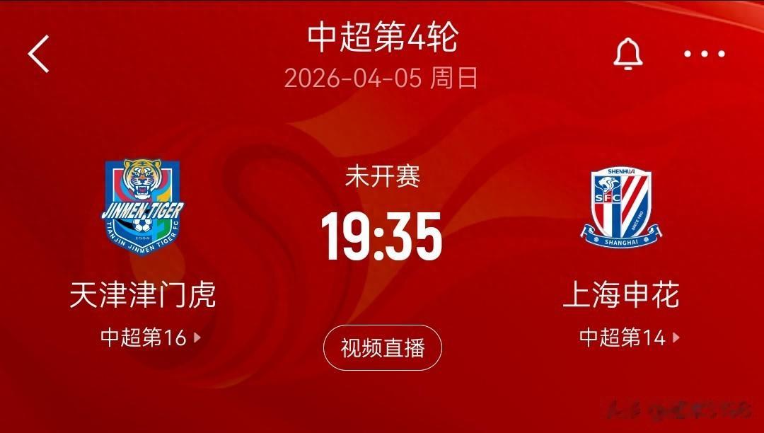 4月5日,2026中超联赛第4轮,天津津门虎主场对阵上海申花比赛将开赛。