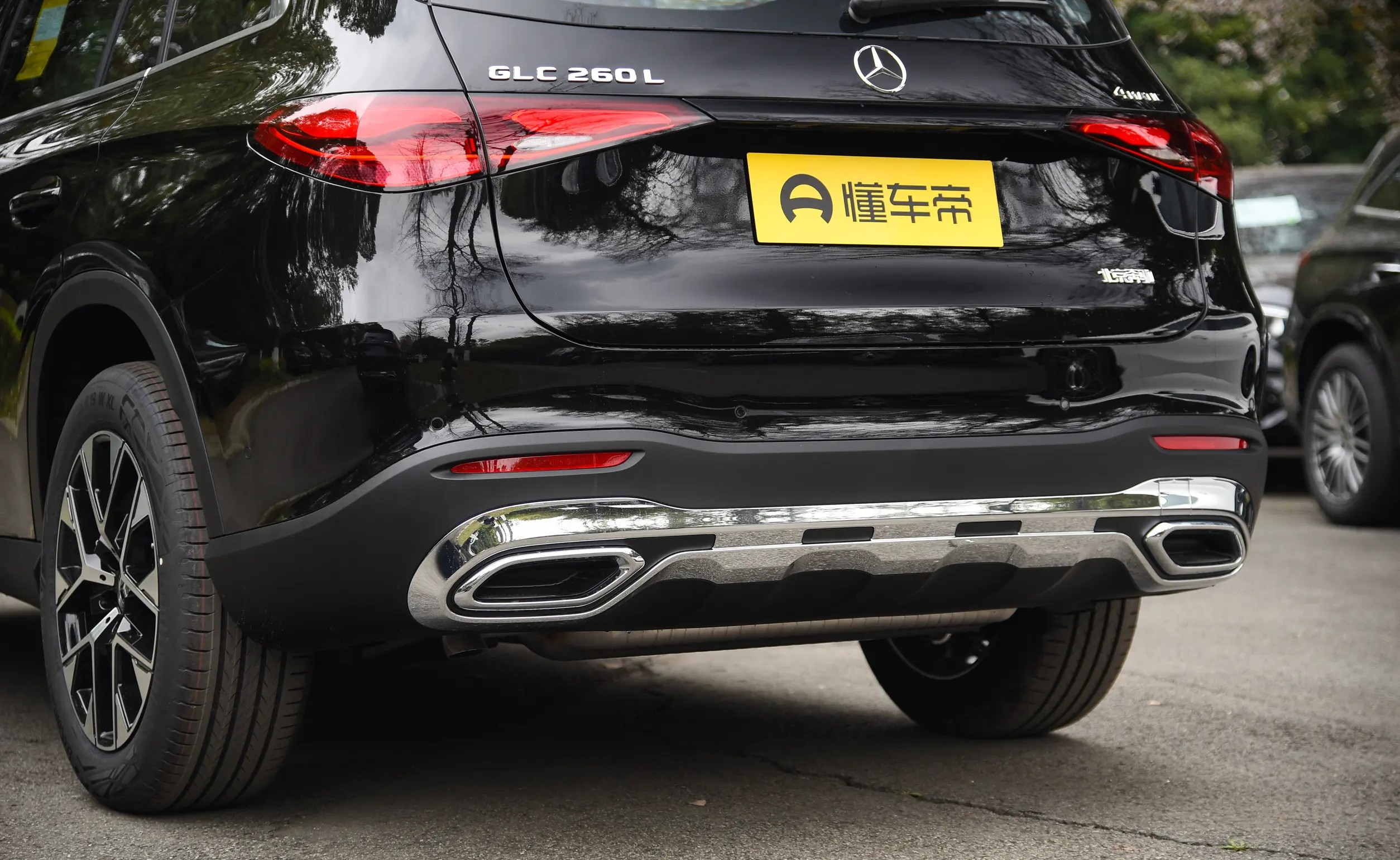 2025款改款奔驰GLC L提供北极白非金属漆,绿砾石银/海夜蓝/时空银/松石绿/石墨灰/曜岩黑/石墨灰金属漆,以及MANUFAKTUR贝母白(亮色)高级定制色9种车漆可选。车尾部分,新车标配双边共两出式排气布局,车尾包围还带有贯穿式镀铬装饰。