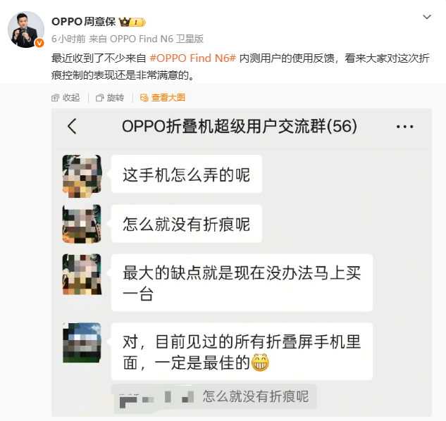 而此次,应用了行业黑科技的OPPO Find N6似乎就带来了更令人惊艳的表现,它的平整度也获得了内测用户的一致认可,几乎看不到折痕的表现甚至让用户暴言: