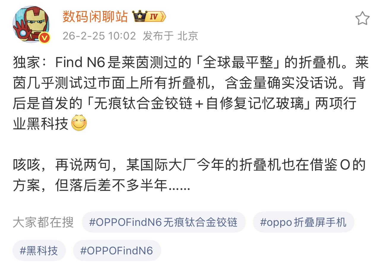就在2月25日,知名数码大V直接放出了一则消息,表示OPPO Find N6目前已经通过了莱茵测试,被其认证为「全球最平整」的折叠机。
